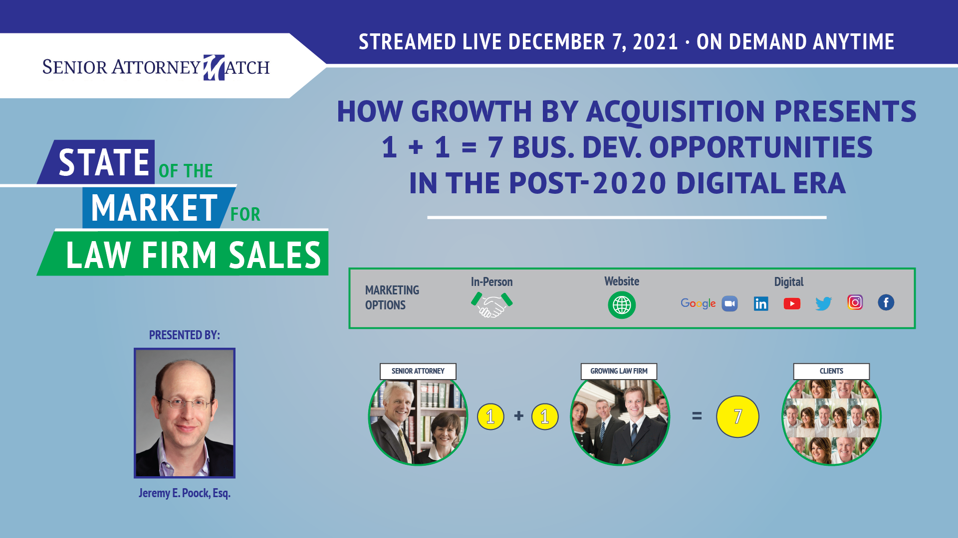 As Senior Attorney Match’s Jeremy E. Poock, Esq. explains, growth by acquisition presents 1 + 1 = 7 Business Development opportunities to Growing Law Firms that can “leverage the experience, the client base, the referral source base, and the know-how of Senior Attorneys in today's 3.0 Digital Era for law firms.