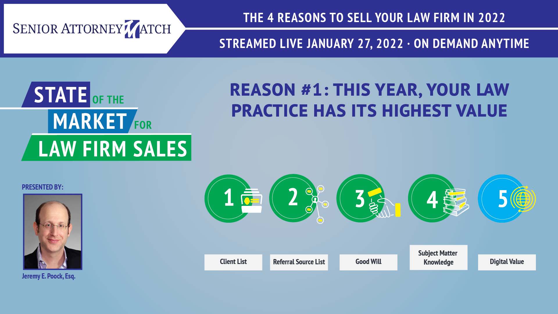 As Jeremy E. Poock, Esq. explains, Senior Attorneys should consider selling their law practices this year because “the value of your law practice this year is at its highest value in comparison to where the value of your practice will be for the remainder of this decade. . . .”