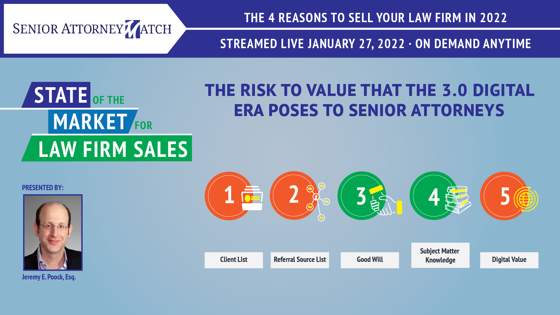As Jeremy E. Poock, Esq. explains, the 3.0 Digital Era poses risks to the 5 Components of Value for Senior Attorney lead law firms for the following reason: