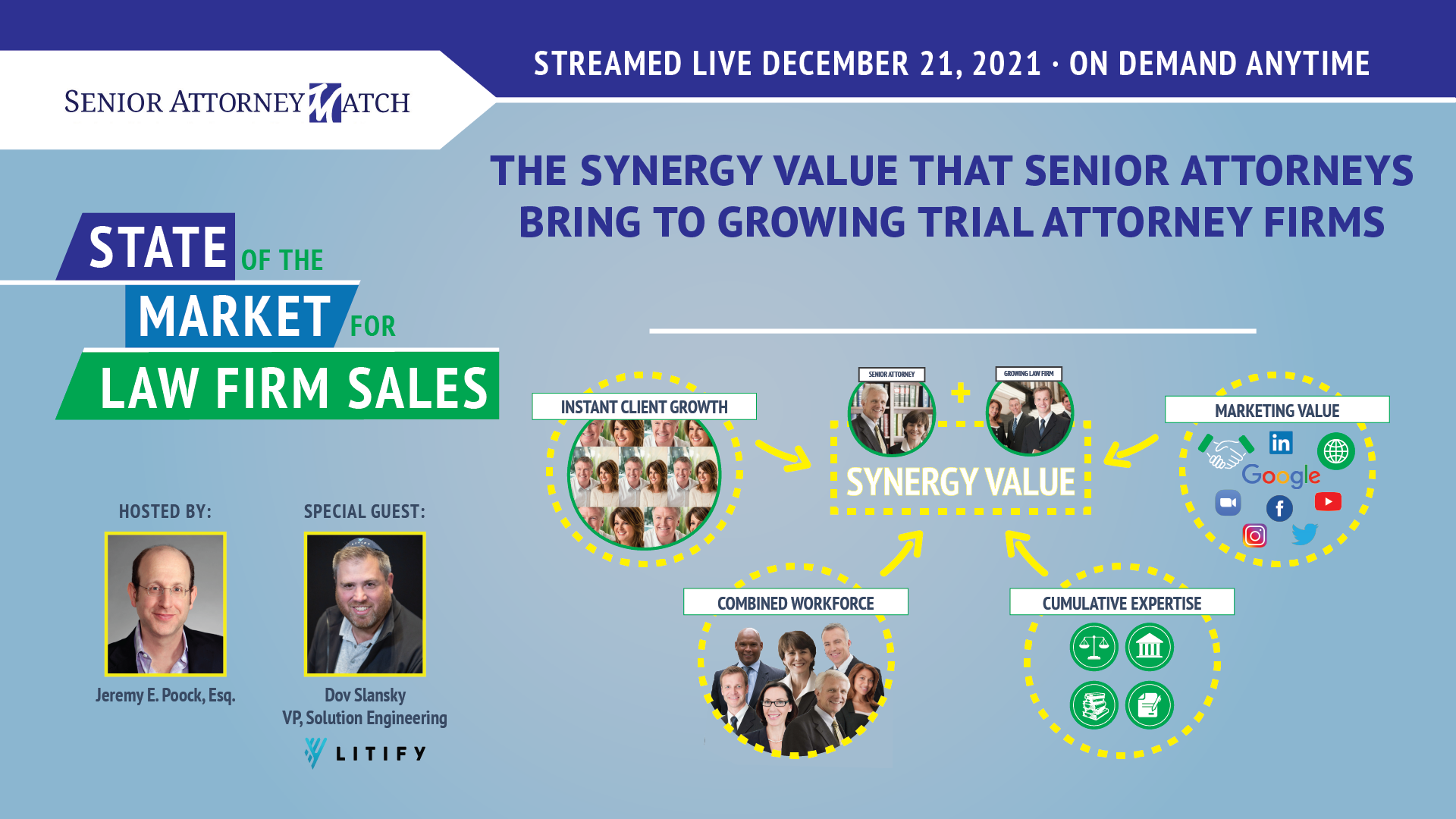 Here, Senior Attorney Match’s Jeremy E. Poock, Esq. and Litify’s Dov Slansky discuss the following 4 components of Synergy Value that Senior Attorney Trial Attorneys present to Growing Trial Attorney Firms:
