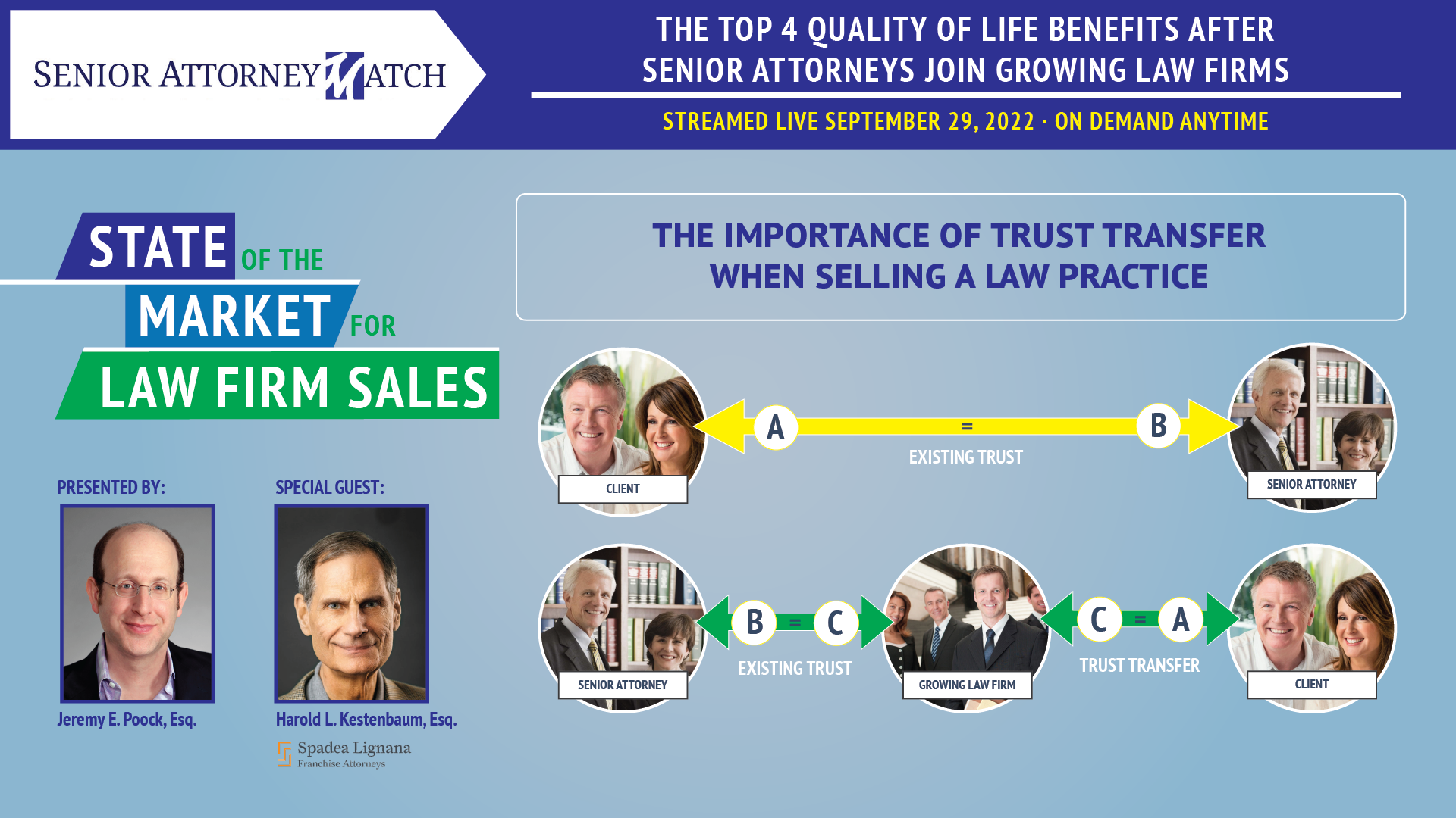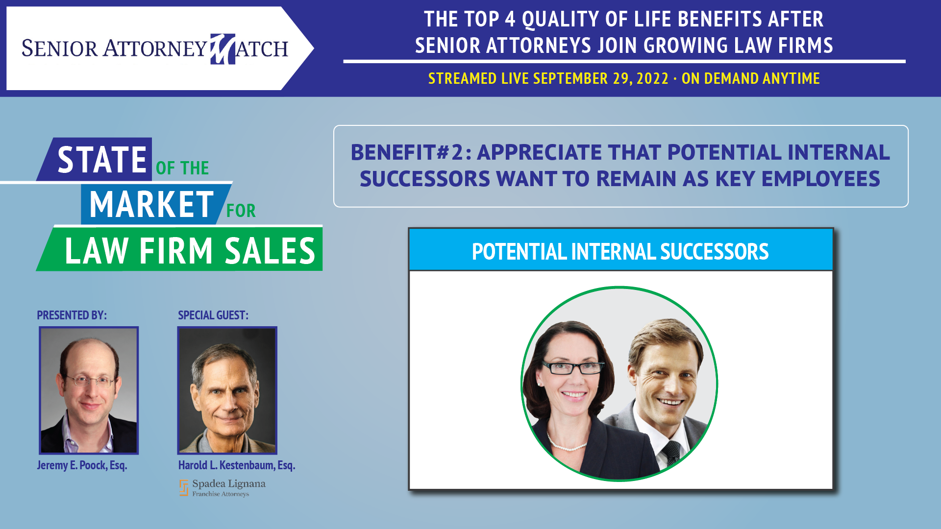 In this episode, Senior Attorney Match’s Jeremy E. Poock, Esq. and special guest, Harold L. Kestenbaum, Esq. of Spadea Lignana Franchise Attorneys, discuss the following top 4 benefits after Senior Attorneys join Growing Law Firms: (1) No longer manage “the Office;” (2) Appreciate that potential Internal Successors want to remain as Key Employees; (3) Transition clients to trusted attorneys; and (4) Enjoy the freedom of more time outside the Office.