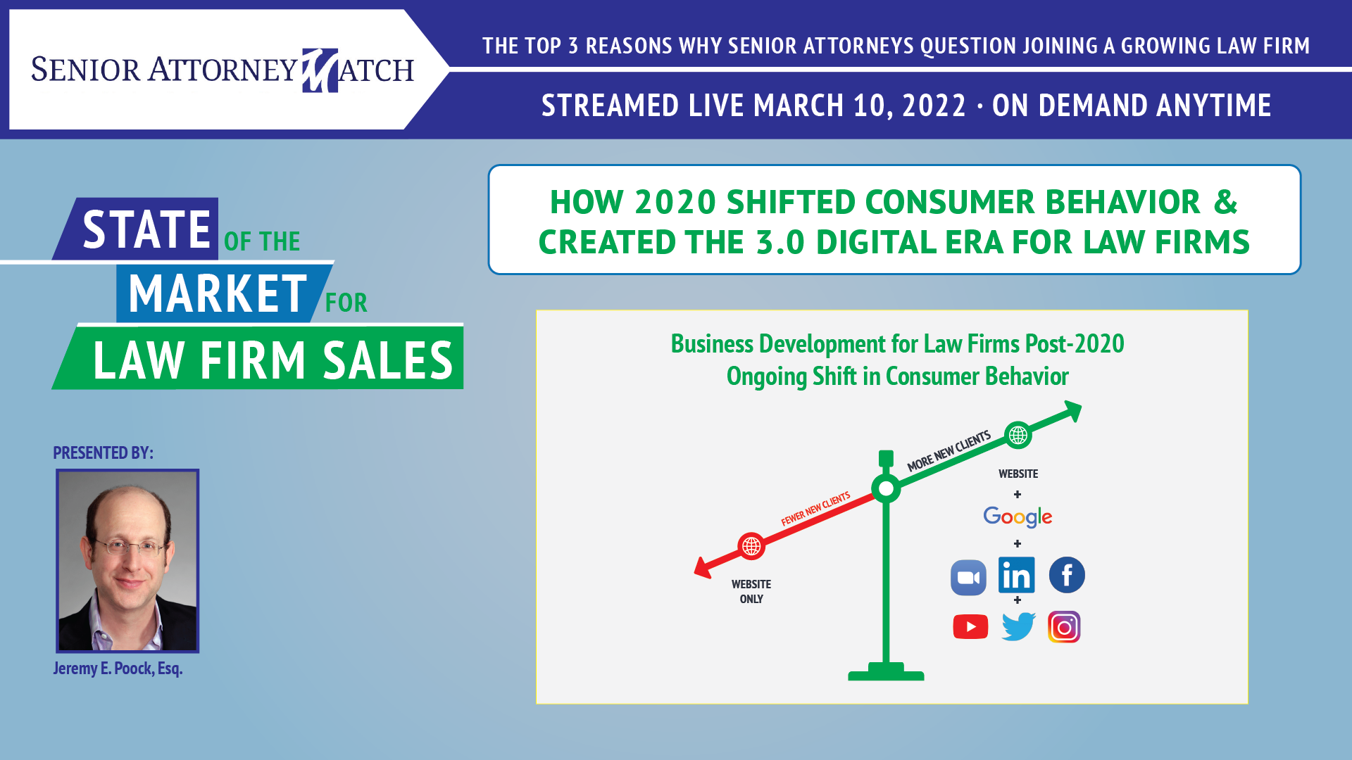 As Jeremy E. Poock, Esq. explains, “2020 caused a shift in consumer behavior. We all shifted digitally in 2020, and 2020 really shifted the legal industry into what we call the 3.0 Digital Era for Law Firms, which means that clients continue to search for their lawyers online.”