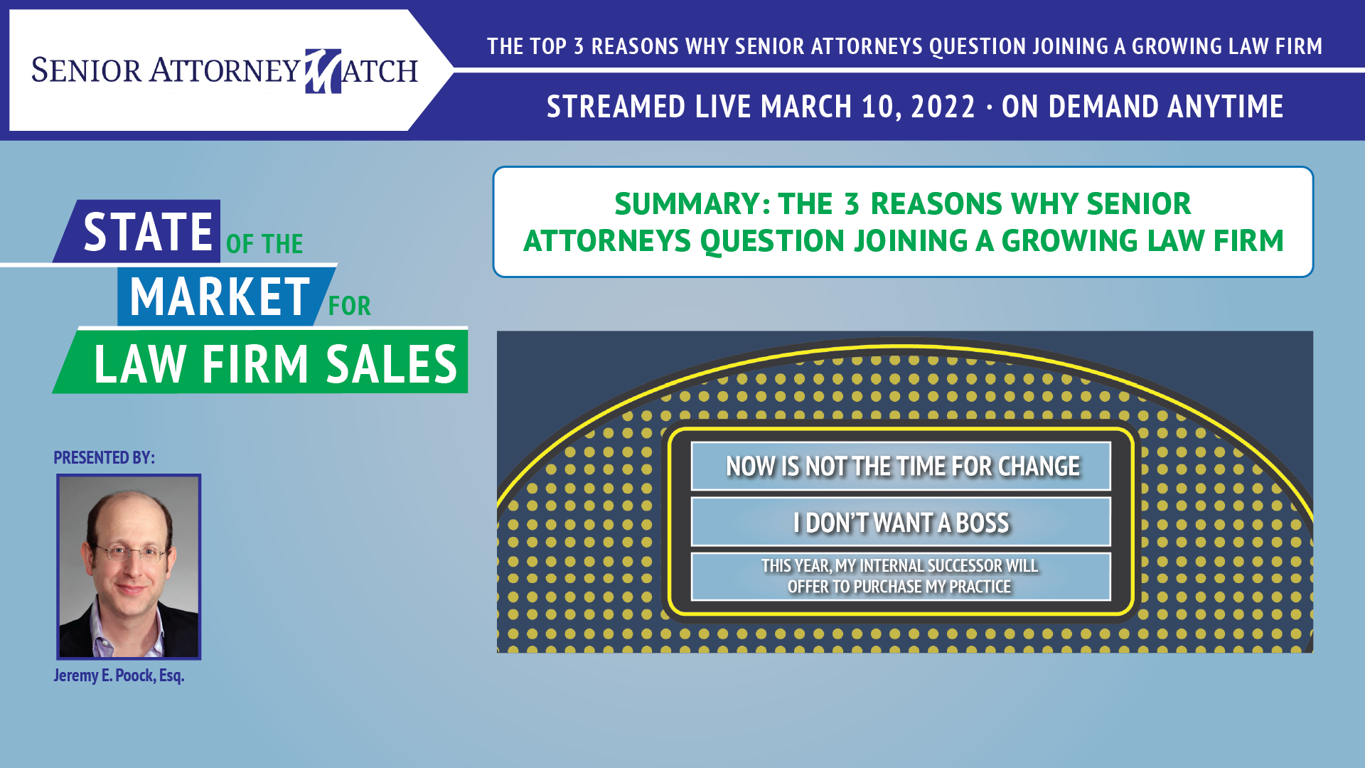 Why Now is the Right Time for Change: “We have to keep in mind that there has been a significant shift in consumer behavior that 2020 caused. Consumers are looking for their lawyers digitally. They're looking online. They're going to Google to search for their lawyers. That is having a significant impact on the components of value for Senior Attorney lead practices, where clients and referral sources are simply not getting replenished as much as they did in yesteryear because senior attorneys by and large are not keeping pace digitally.”